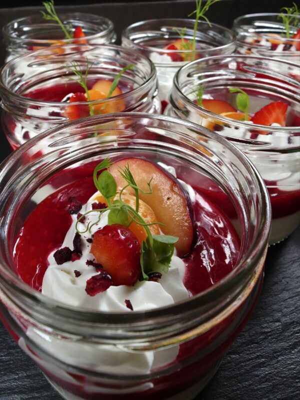 Saldais krējums, piens, svaigas ogas, cukurs, želatīns, vaniļas ekstrakts