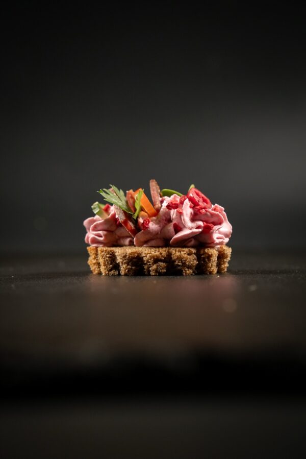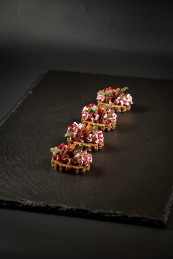 Rudzu tosts, biešu krēms, vītināta liellopu gaļa.